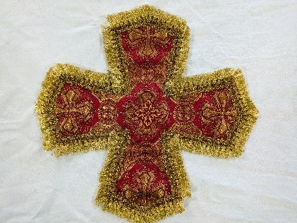 Obiectul reprezintă o bucată de material textil din brocard, model preoțesc, de culoare roșie cu auriu, în forma unei cruci cu braţele egale, ornamentată pe margini cu dantelă cu franjuri, cu fir metalic, de culoare aurie. Pe centrul acoperământului este cusută o broderie sub forma crucii. Acoperământul pentru Sfântul Potir a fost introdus în uzul liturgic probabil, pentru a feri Sfintele Daruri de praf şi insecte. Este fabricat din același material ca celelalte acoperăminte și din care sunt făcute veșmintele slujitorilor bisericești.