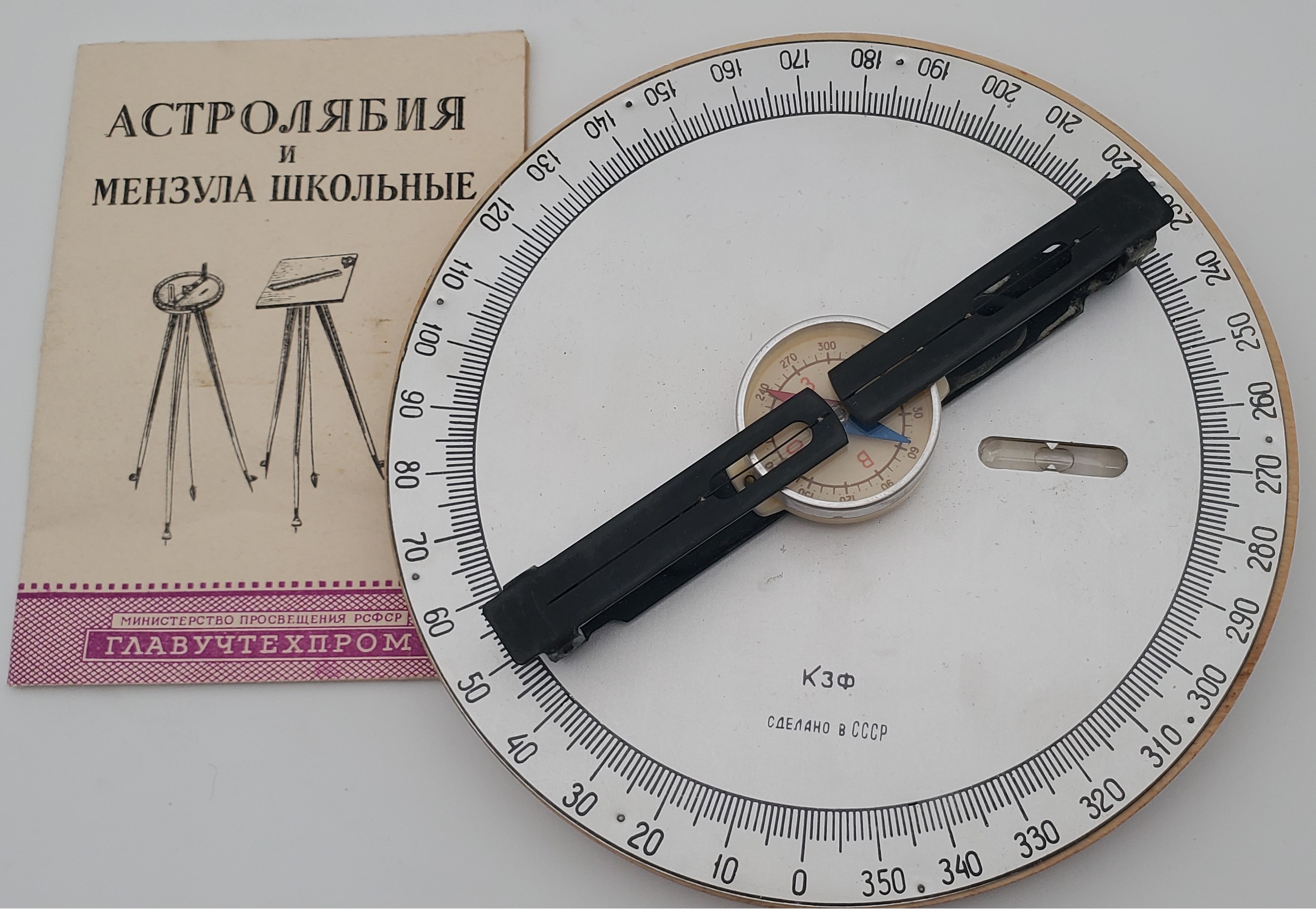 Piesa este de formă rotunda, realizată din placaj, peste care este suprapusă o placă de aluminiu cu un cerc gradat 360 de grade, iar în partea centrală are o nivelă tubulară de precizie. Pe diametrul cercului este fixată o bandă metalică de culoare neagră, cu capetele mobile, cu perforări. În centrul construcției este fixată o busolă. Dispozitivul este așezat într-o cutie de carton cu capac. Obiectul este însoțit de pașaport în limba rusă. Acest obiect este folosit pentru măsurarea poziției aștrilor și a înălțimii lor deasupra orizontului.