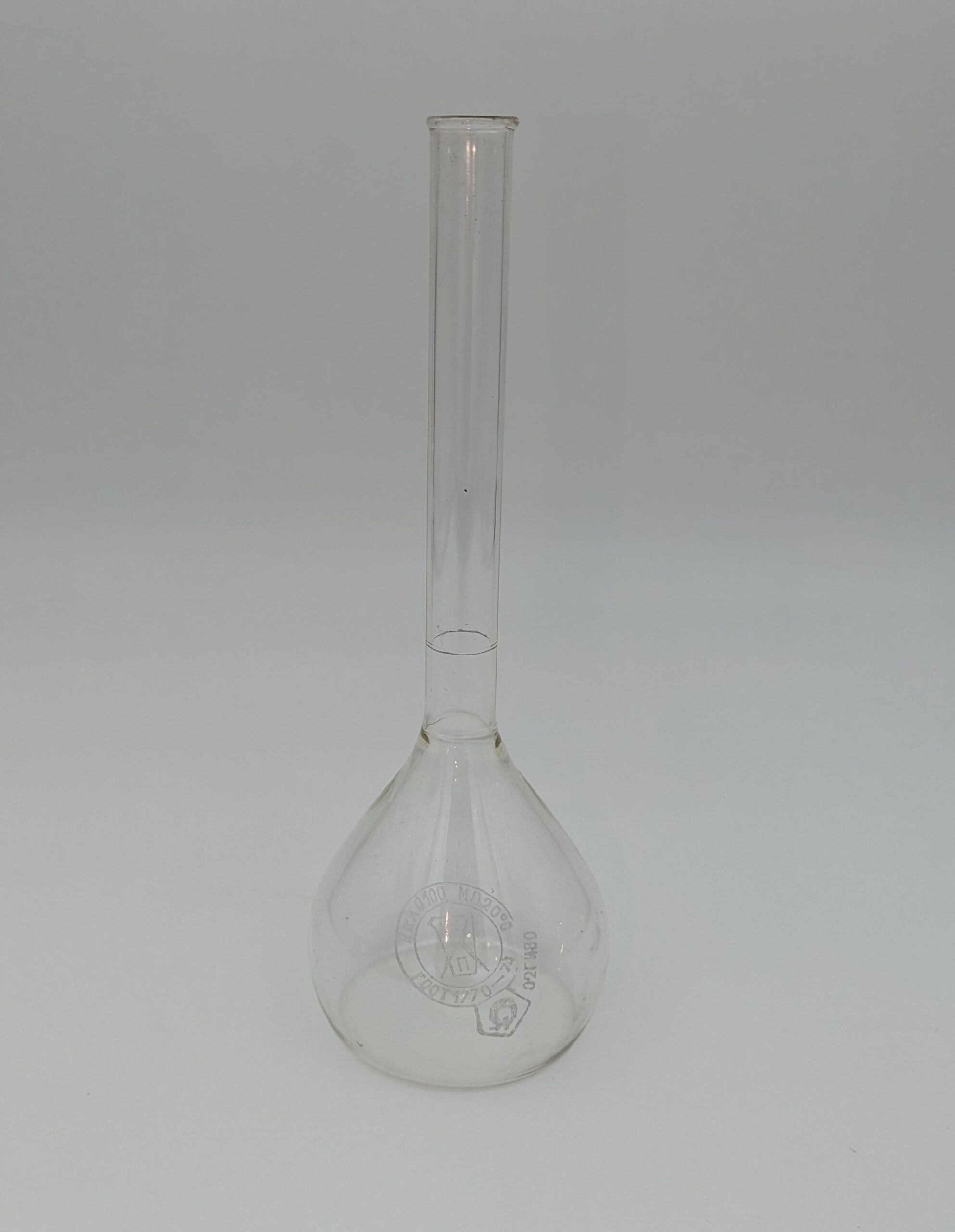 Vas de laborator de formă conică cu fundul plat și gâtul alungit (Î: 10,5 cm), marcat cu un semn circular care delimitează capacitatea de umplere a acestuia, din sticlă rezistentă chimic și termic. Pe sticlă este aplicat logoul producătorului, țara, clasa de rezistență, o marcă de verificare, un număr standard de stat, o clasă de precizie și o temperatură de calibrare. Utilizat pentru măsurarea cu exactitate a volumelor de lichide sau prepararea soluțiilor de concentrații cunoscute.