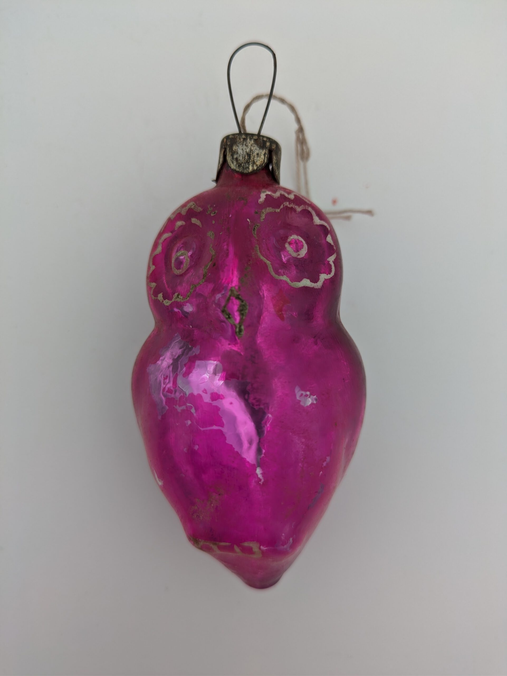 Decorațiune pentru brad din sticlă de culoare roză. Partea dorsală acoperită cu vopsea argintie, partea din față- transparentă. Este o figurină stilizată a unei bufnițe. Corpul este de formă conică. Partea din spate este vopsită din interior, partea din față este transparentă. Ochii, nasul și ghearele sunt pictate cu vopsea albă. În partea de sus – un dispozitiv de fixare metalic pentru a o atașa la pomul de Crăciun.