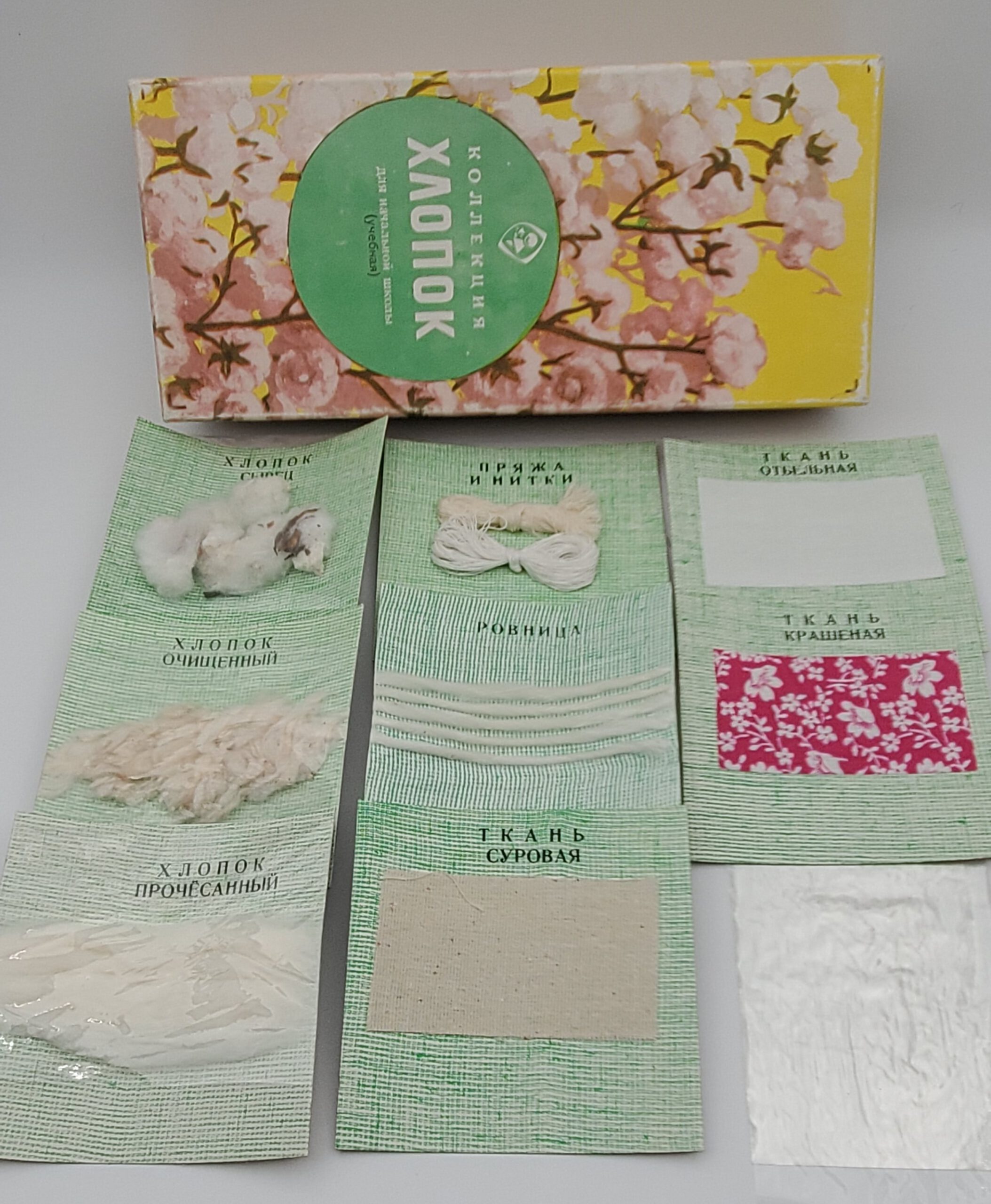Colecția constă dintr-un set de mostre naturale, care demonstrează principalele etape ale producției de țesături de bumbac – de la materii prime la produse finite: bumbac brut, bumbac curățat, bumbac pieptănat, fibre răsucite, fire și ață, țesătură brută, țesătură albită, țesătură vopsită. Mostrele sunt încleiate pe 8 cartonașe (L: 12,5x 12,5 cm) și așezate într-o cutie cu capac. Este inclusă o foaie cu instrucțiuni (L: 30,2 cm, LA: 10 cm) de utilizare și 6 bucăți de peliculă (L: 29,2 cm, LA: 9,5 cm) protectoare. Pe capac, din exterior pe fundal galben, imaginea plantei de bumbac, pe care-i suprapus un cerc de culoare verde, cu logo-ul combinatului și inscripții în limba rusă în patru rânduri: [коллекция / хлопок / для начальной школы / учебная] – colecția/ bumbac/ pentru școala primară/educațională. Din interior, denumirea producătorului și denumirea mostrelor de colecție. Colecția poate fi folosită la lecțiile de științe sau de educație tehnologică în clasele primare.