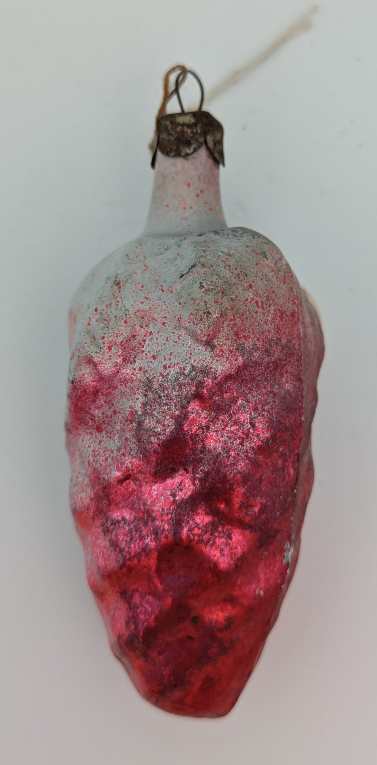 Decorațiune pentru brad din sticlă, sub formă de con alungit cu capătul ascuțit, ornamentul reliefat imită solzii de pe con, de culoare jumătate roz, altă jumătate are culoare argintie. Partea de sus este acoperită cu vopsea albă pentru a imita zăpada. În partea de sus un dispozitiv de fixare metalic.