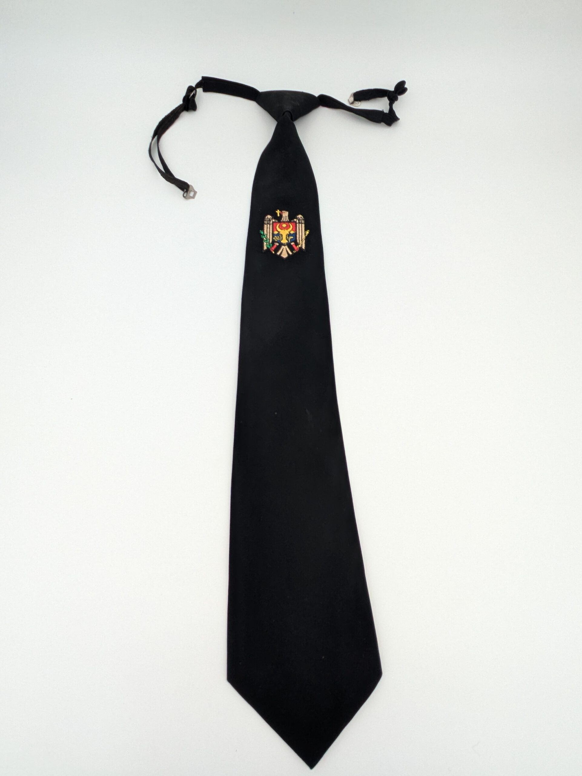 Cravata este confecționată din ţesătură (poliester) de culoare neagră, ce reprezentă o fâşie trapezoidală, cu stema Republicii Moldova brodată în partea de sus, care se termină printr-un unghi ascuţit, dintr-un nod permanent şi o bentiţă care se trece în jurul gâtului. Se încheie cu furnitură metalică.