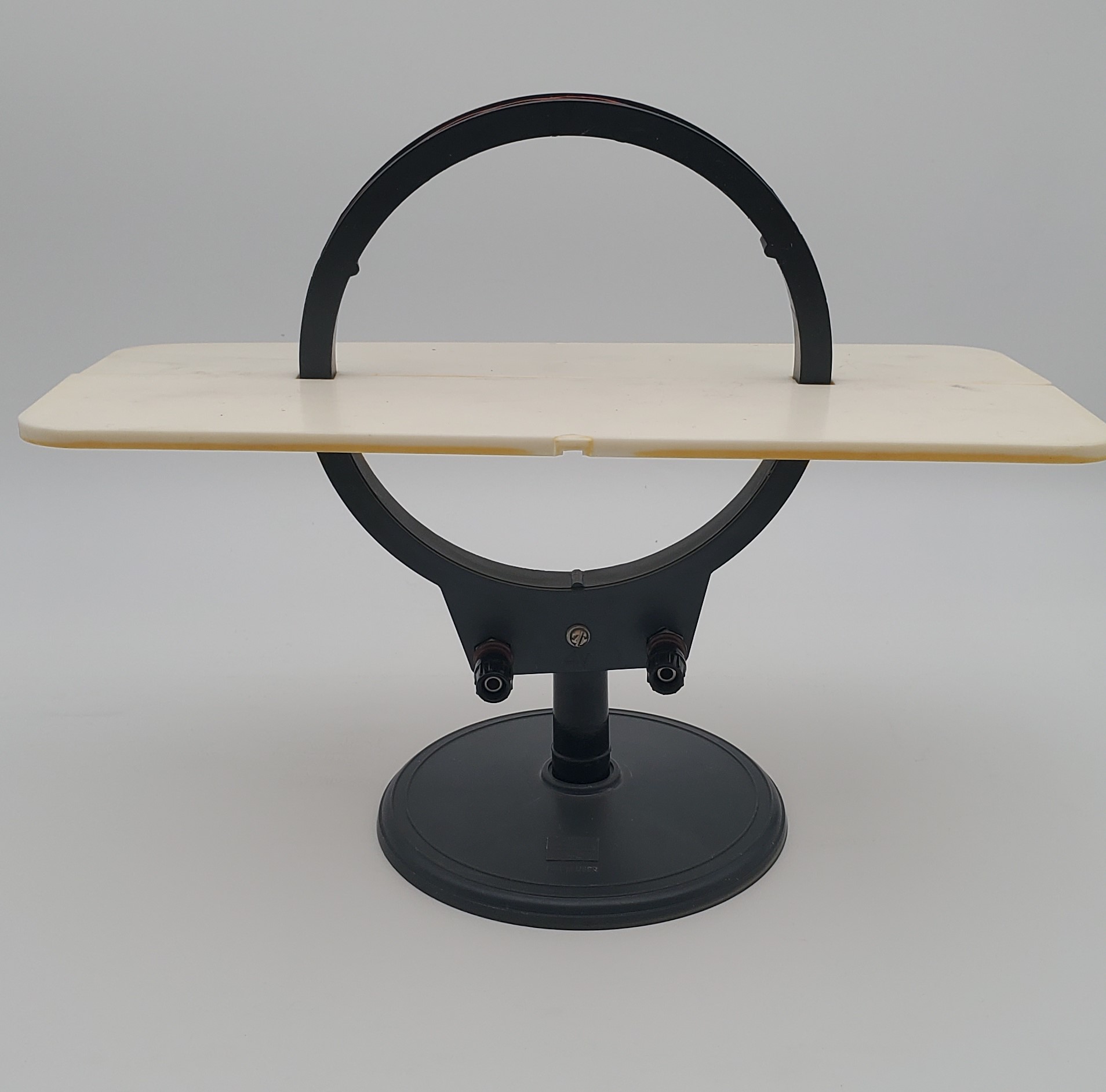 Dispozitivul este alcătuit dintr-o bobină (D: 16 cm, Î: 23 cm, Gr: 1,5 cm) cu sârmă de cupru emailată neagră, fixată pe un cadru din plastic negru, o bază neagră (D: 14 cm) și un ecran (L: 29,7 cm, LA: 8 cm) de culoare albă. Ecranul este alcătuit din două platforme din plastic, cu câte două tăieturi fiecare. Dispozitivul este așezat într-o cutie de carton cu capac. Pe capac, pe centru, imaginea dispozitivului și informație în limba rusă: [Катушка для демонстрации магнитного поля тока] (Dispozitive pentru observarea câmpului magnetic al curentului electric), [Министерство просвещения РСФСР] (Ministerul Educației RSFSR); [Главучтехпром] (Direcția Principală a Întreprinderilor din Industria Educațională și Tehnică); [Завод №4 «Физэлектроприбор» г. Москва, ул. Электрозаводская 33] (or. Moscva, str. Electrozavodscaia 33, Uzina № 4 „Fizelectropribor”); [Учебная] (Educațional); [ТУ 79 РСФСР 442-79] (Condiții tehnice RSFSR). Acest material didactic este recomandat pentru lecțiile de fizică.