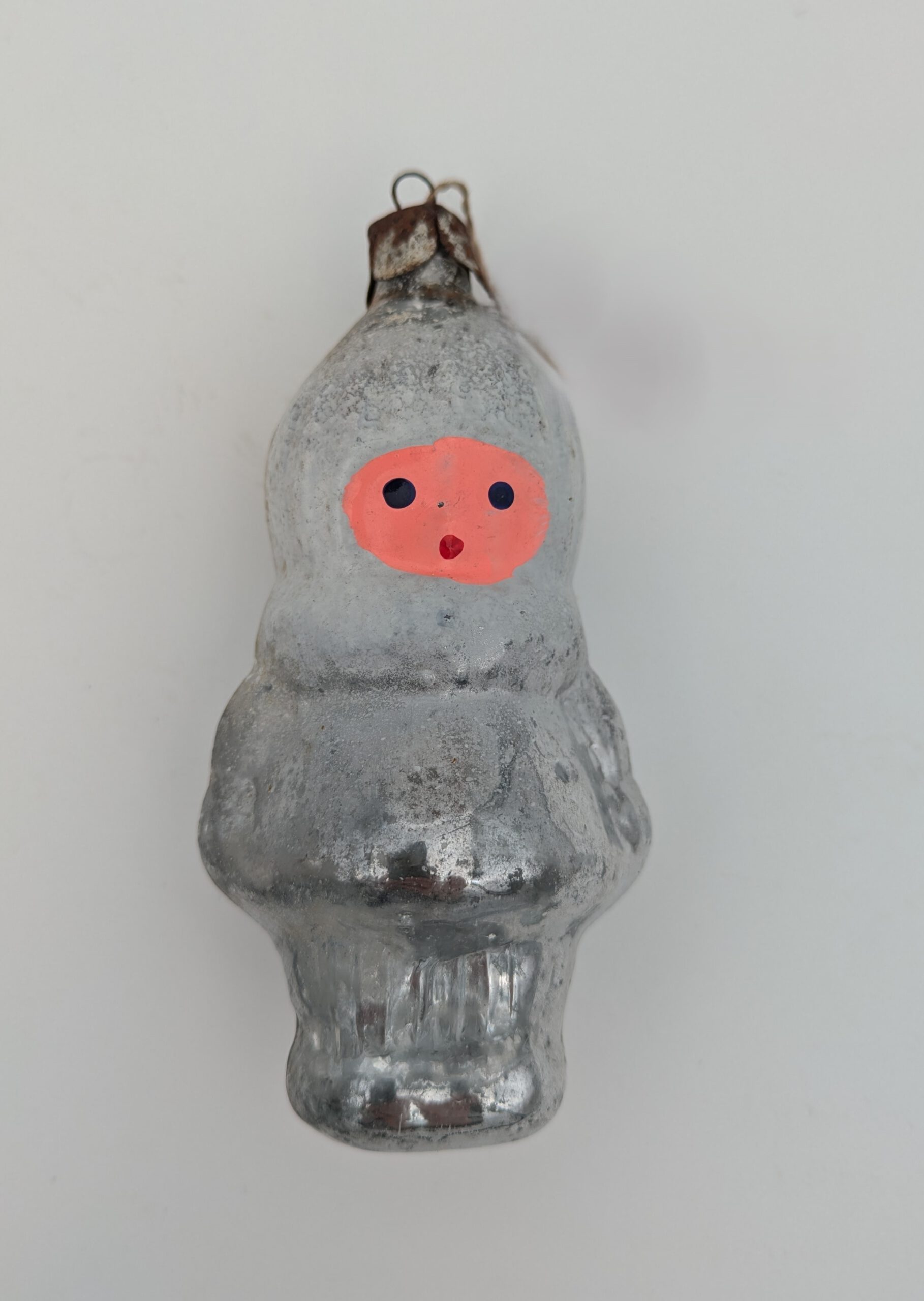 Decorațiune pentru brad din sticlă strălucitoare argintie. Este o figurină stilizată a unei fetițe îmbrăcate într-o haină de blană, căciuliță și pantaloni. Căciulița, gulerul, părtea inferioară a hainei din spate și pantalonii sunt evidențiate în alb. Fața este pictată cu vopsea roz, ochii sunt negri, gura – roșie. În partea de sus un dispozitiv de fixare metalic pentru a o atașa la pomul de Crăciun.