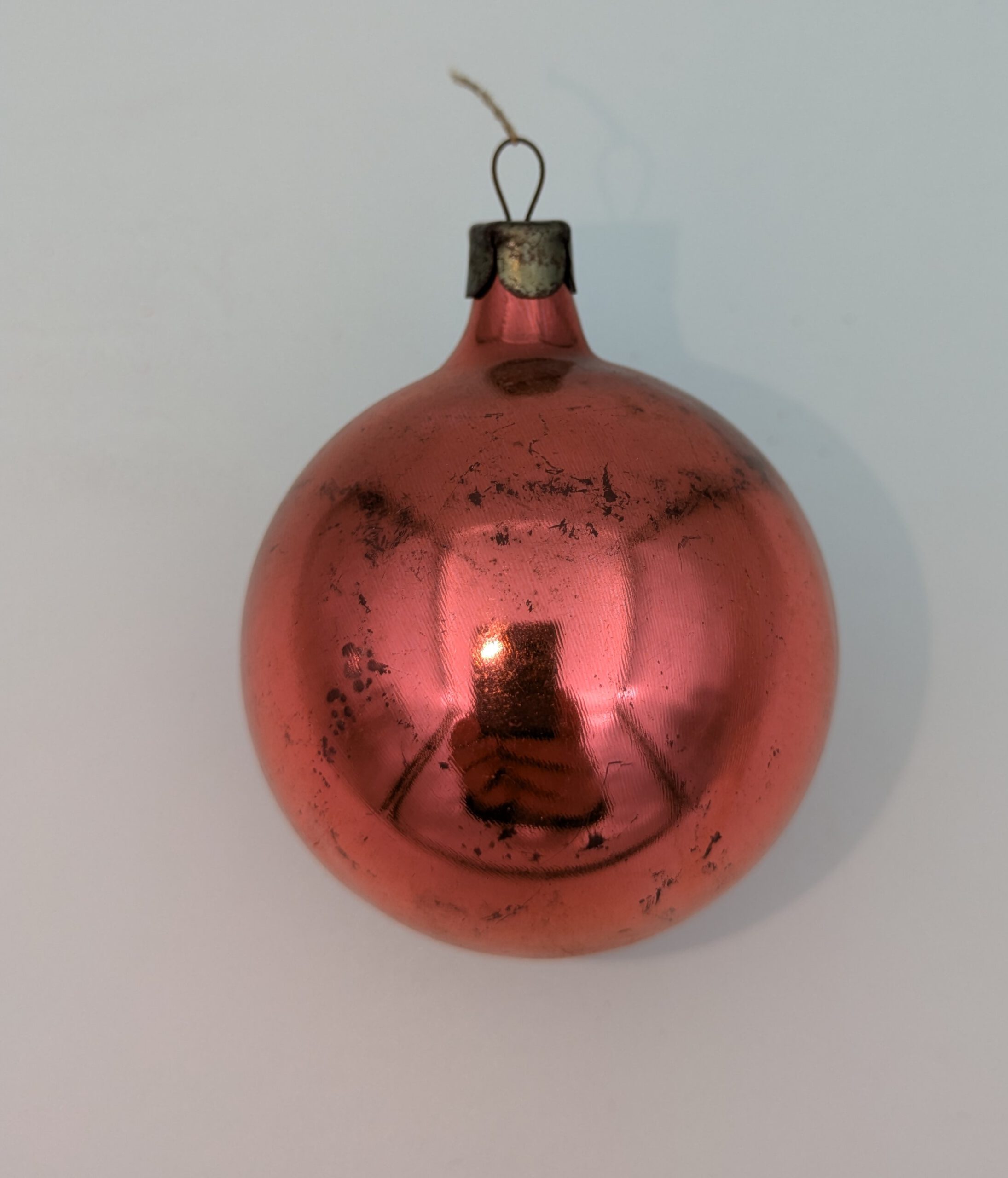 Decorațiune pentru brad în formă de glob din sticlă strălucitoare roză. În partea de sus un dispozitiv de fixare metalic pentru a o atașa la bradul de Crăciun.