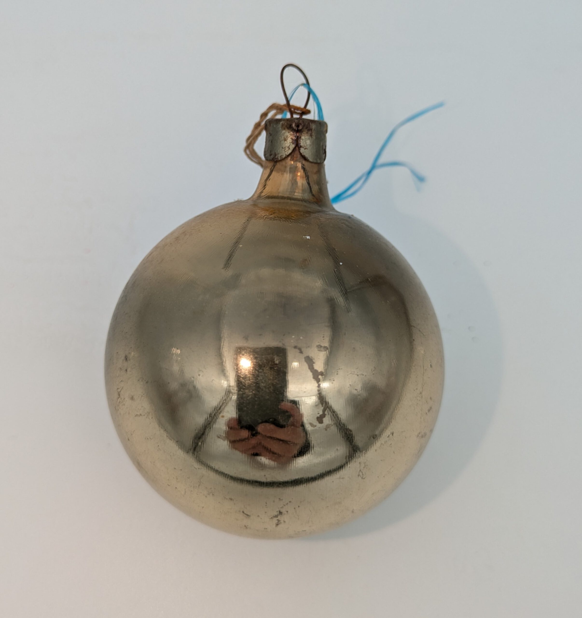Decorațiune pentru brad în formă de glob din sticlă strălucitoare auriu-verzuie. În partea de sus – un dispozitiv de fixare metalic pentru a o atașa la bradul de Crăciun.