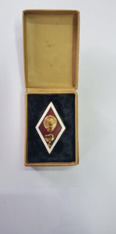 Insigna are forma unui romb ușor convex acoperit cu email roșu; pe margine insigna este decorată cu email alb. Pe avers, în centru, este stema Uniunii Sovietice, de culoare aurie. Mai jos este simbolul medicinei, de culoare aurie. Pe revers există un șurub cu o piuliță pentru atașarea insignei de haină. (Insignele pentru absolvenții instituțiilor superioare de învățământ din URSS au fost instituite prin decretul Prezidiului Sovetului Suprem al URSS din 4 septembrie 1945). Pe piuliță este inscripția în rusă: [ЛЕНИНГРАДСКИЙ / МОНЕТНЫЙ ДВОР]. Pe reversul insignei este logoul producătorului. Insigna este în cutie de carton.