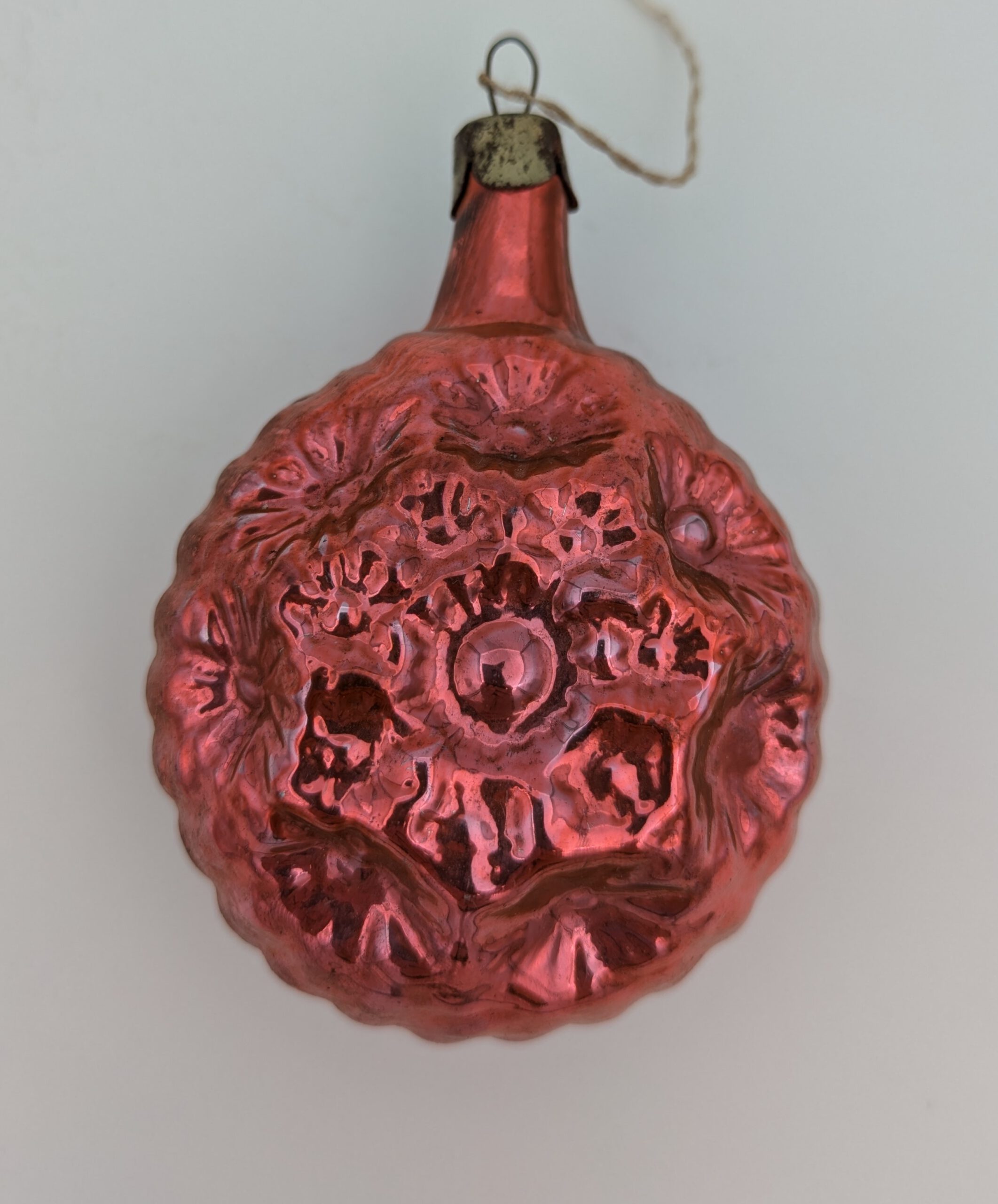 Decorațiune pentru brad din sticlă strălucitoare roză, sub formă unui medalion cu două fețe, cu margină striată, cu fulgi de nea convex. În partea de sus un dispozitiv de fixare metalic pentru a o atașa la bradul de Crăciun.