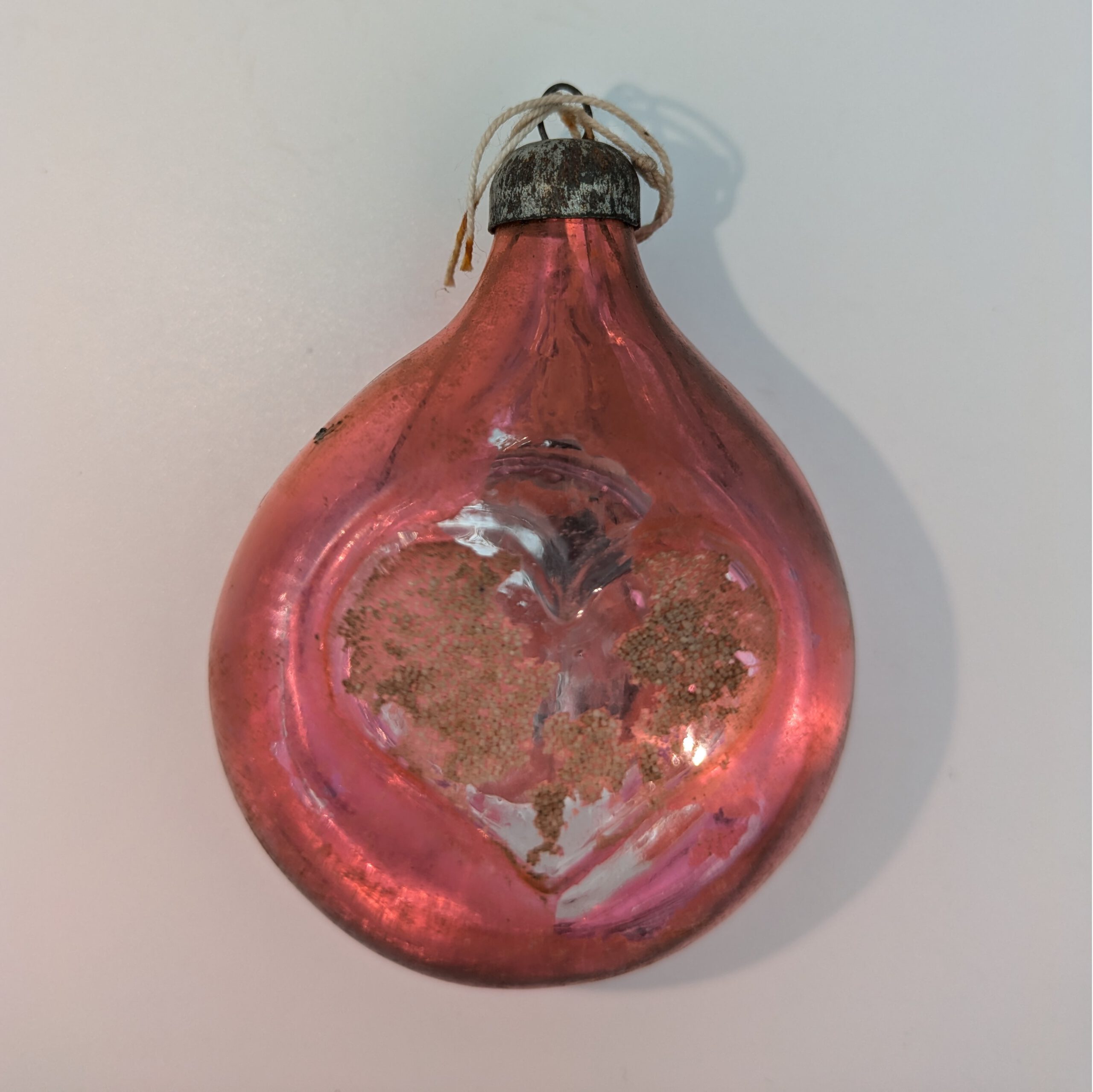 Decorațiune pentru brad din sticlă strălucitoare roză, sub forma unui medallion. Partea din spate este vopsită din interior, partea din față este transparentă, cu o inimă convexă, acoperită cu vopsea albă, pentru a imita zăpada. În partea de sus un dispozitiv de fixare metalic pentru a o atașa la bradul de Crăciun.
