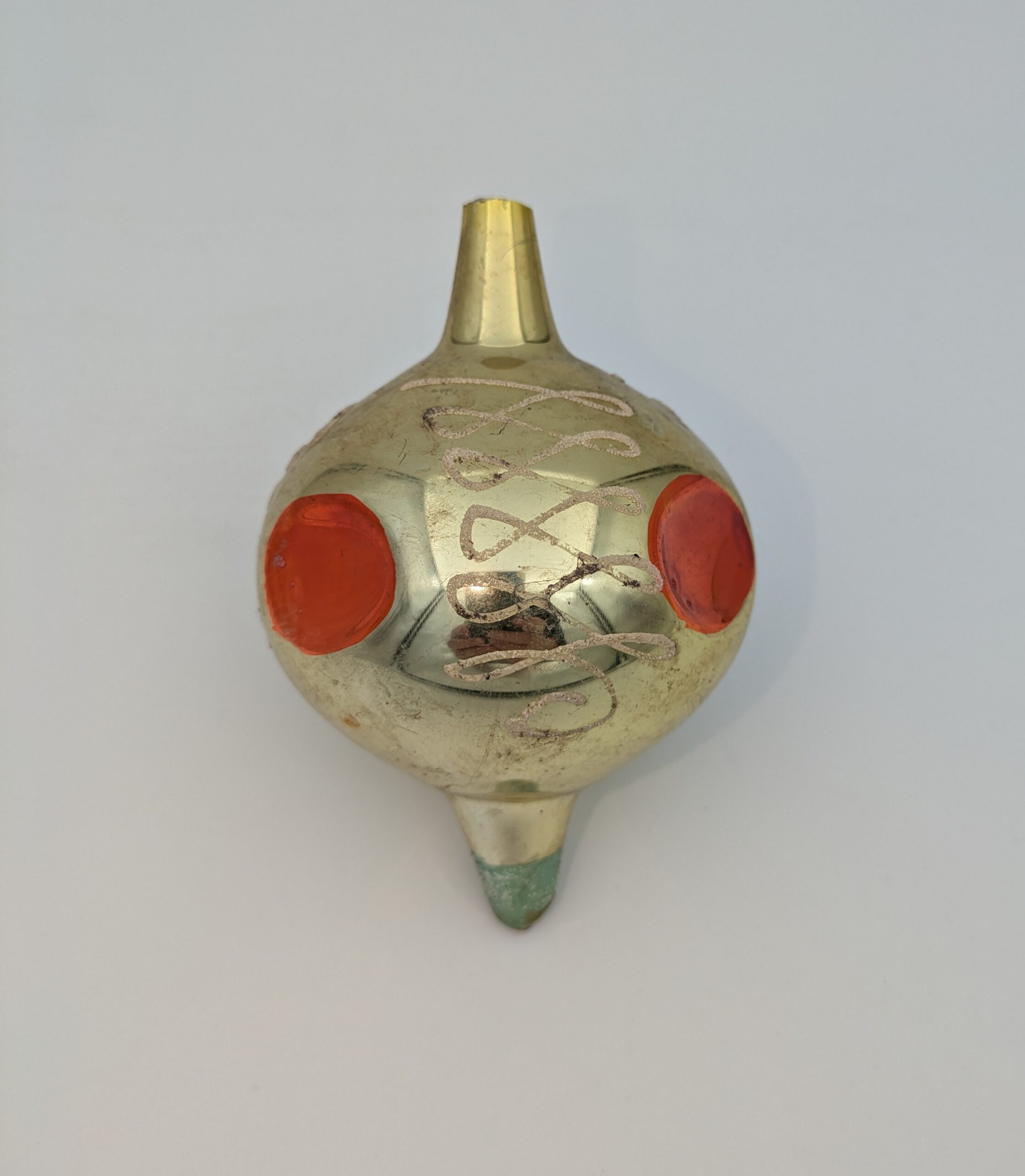 Decorațiune pentru brad din sticlă strălucitoare aurie, sub formă de glob alungit, cu capătul ascuțit (acoperit cu vopsea albă, pentru a imita zăpada). Cu trei reflectoare ovale, de culoare oranj, între care sunt desenate serpentine cu vopsea albă. Lipsește dispozitivul de fixare.